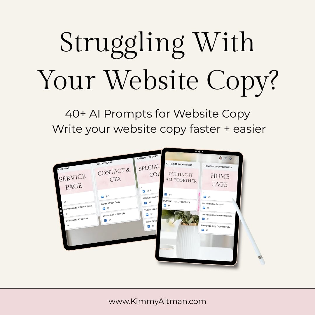 Grab my 40+ Ready-to-Use AI Prompts designed to make writing your website copy faster, easier, and way less overwhelming. You’ll get powerful, fill-in-the-blank prompts plus a quick how-to video so you can confidently write copy that connects and converts. Perfect for busy women entrepreneurs who just want a clear, simple starting point.
